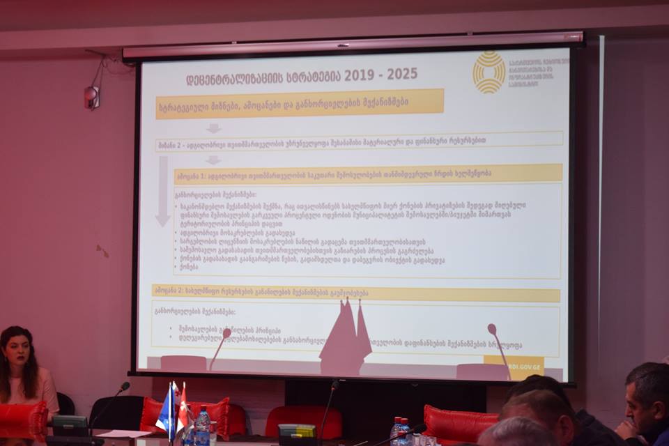 ასოციაციისა და სამინისტროს წარმომადგენლებმა მერებსა და საკრებულოების თავმჯდომარეებს დეცენტრალიზაციის საშუალოვადიანი სტრატეგიის შესახებ დეტალური ინფორმაცია მიაწოდეს და დამსწრე საზოგადოებას დოკუმენტში ასახული ძირითადი მექანიზმები გააცნეს.
