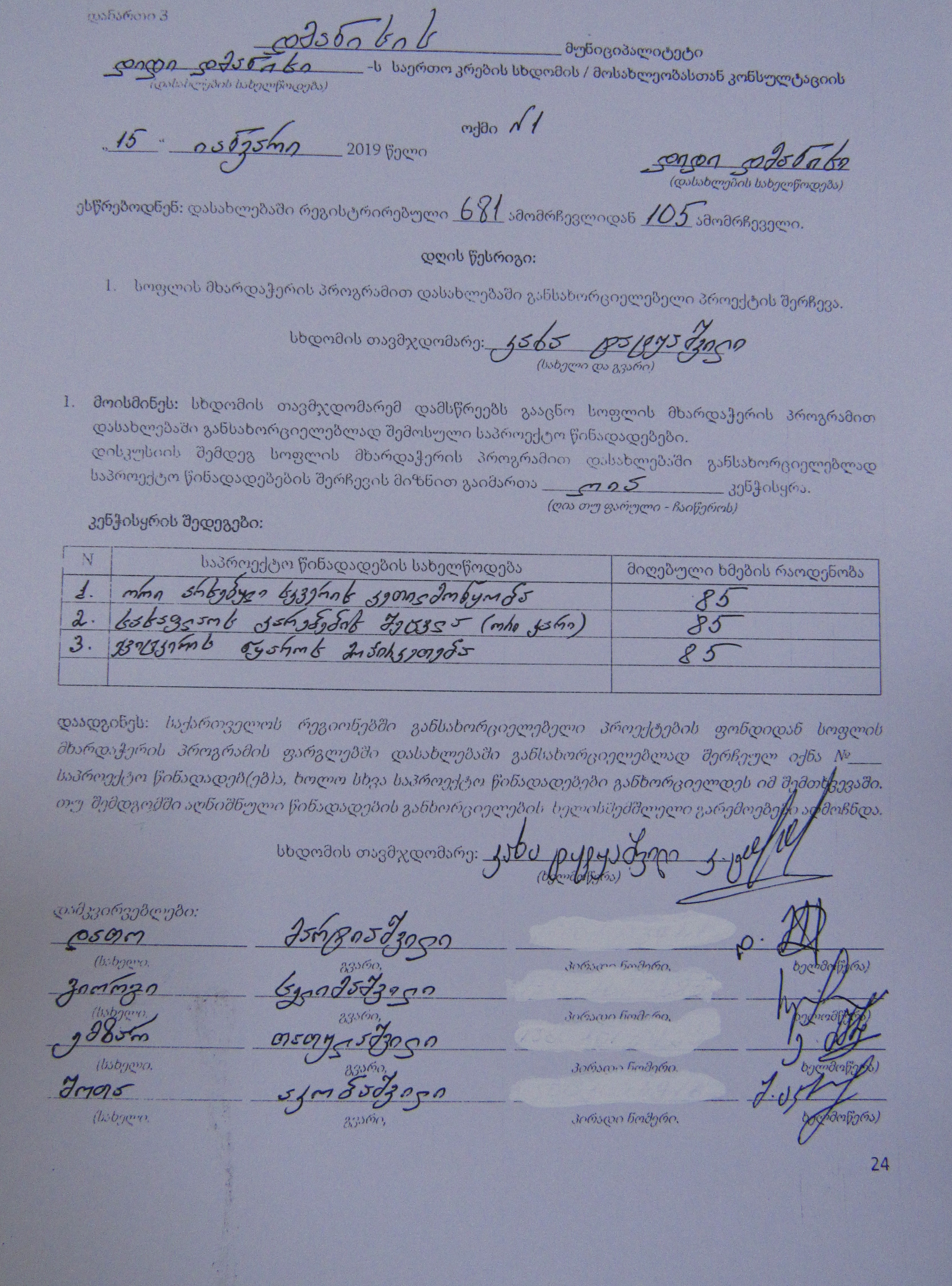 მიმდინარე წლის 15 იანვარს, სოფლის მხარდაჭერის პროგრამის ფარგლებში, სოფ: დიდი დმანისში, მოსახლეობასთან ჩატარებული  კონსულტაციის ოქმი.