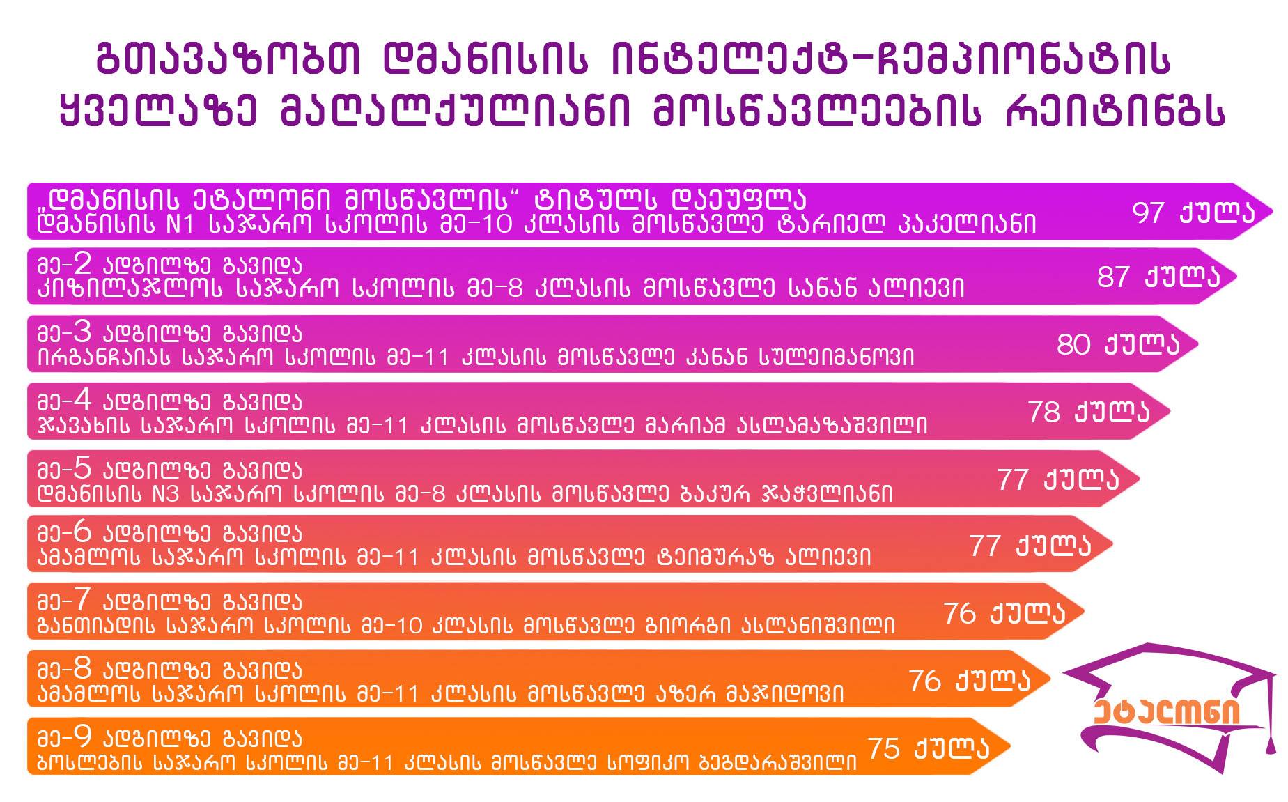 დმანისის ინტელექტ-ჩემპიონატის ყველაზე მაღალქულიანი მოსწავლეების რეიტინგი